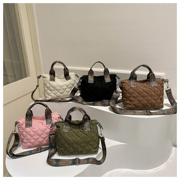 Women Wide Shoulder Belt Handbag Large Capacity All-Match Shopping Tote Bag Fall/Winter Rhombus Space Cotton Shoulder Bag